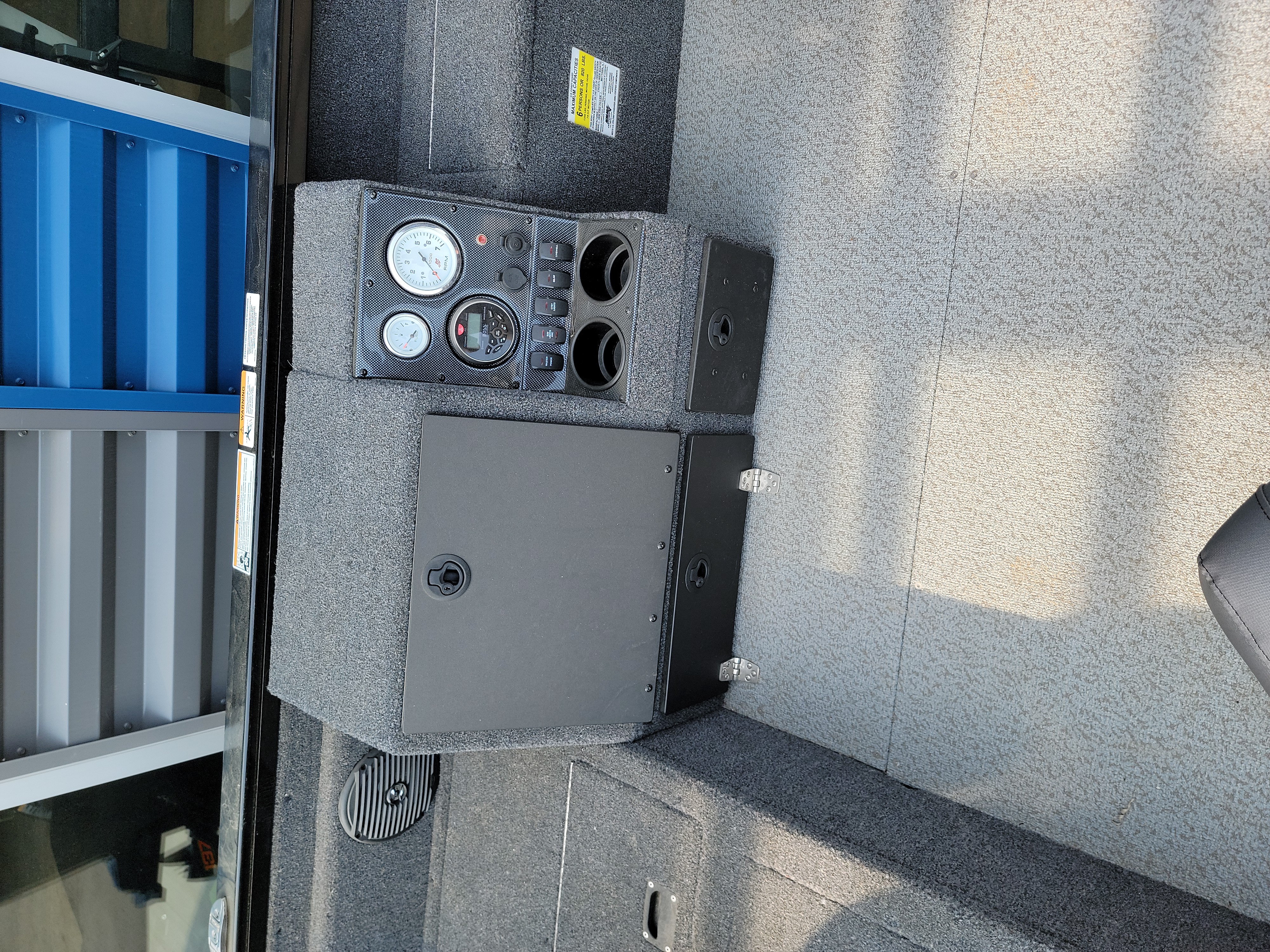 - Command console, w/lockable storage & electronics compartment, w/pull-out tray, lockable storage drawer, tackle storage, drink holders (2), gauges, rocker switches & 12V power outlet