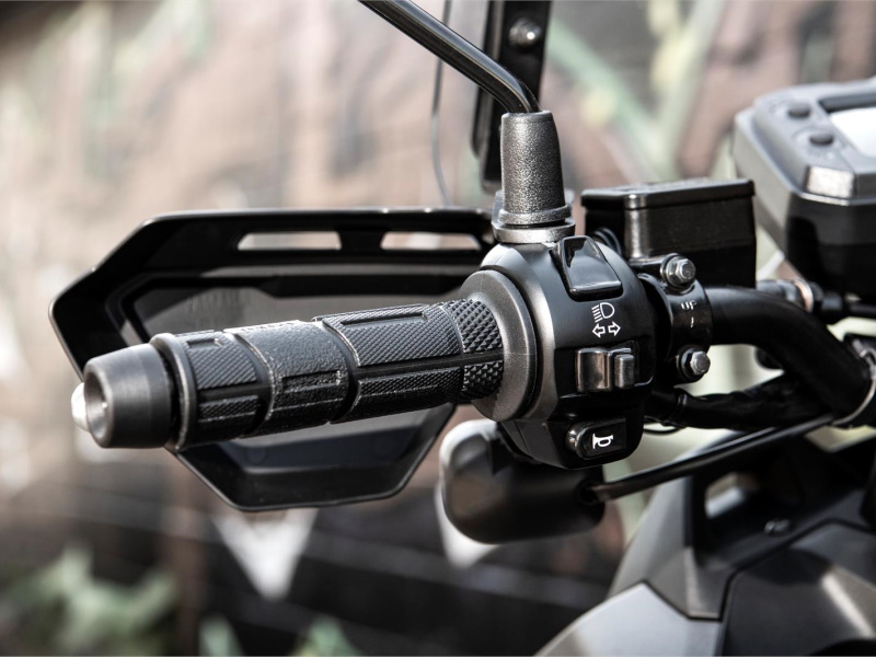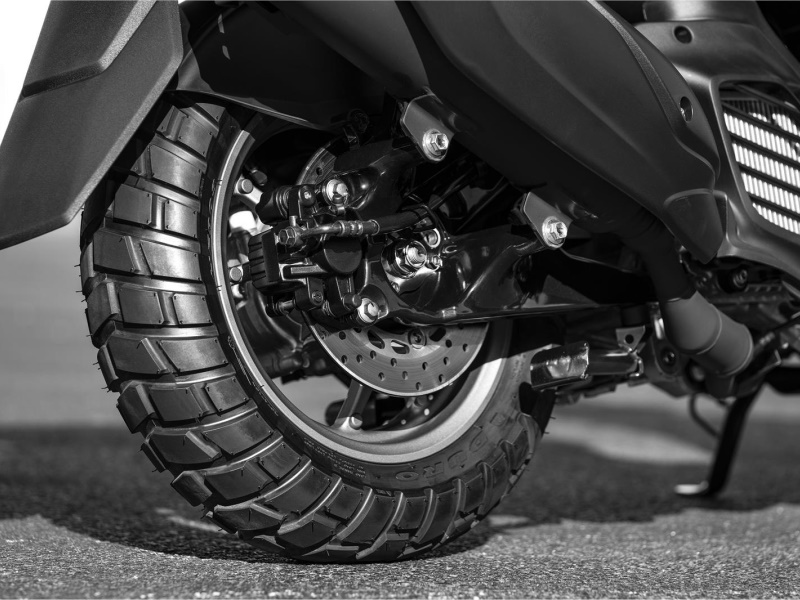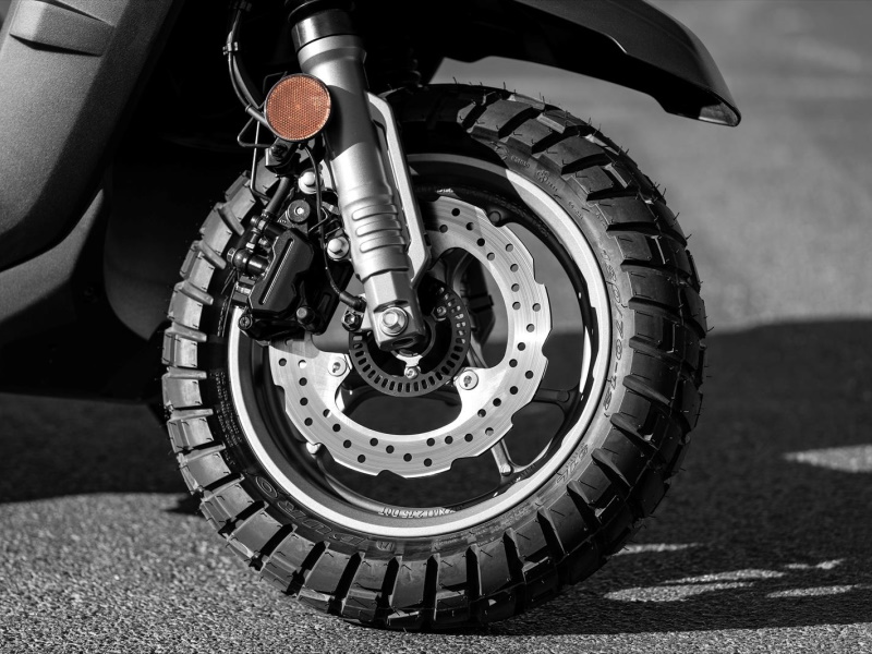 Fat 120/70-12 front and 130/70-12 rear DURO tubeless tires have an aggressive looking block pattern combined with lightweight wheels for great handling on unpaved roads and on the street.