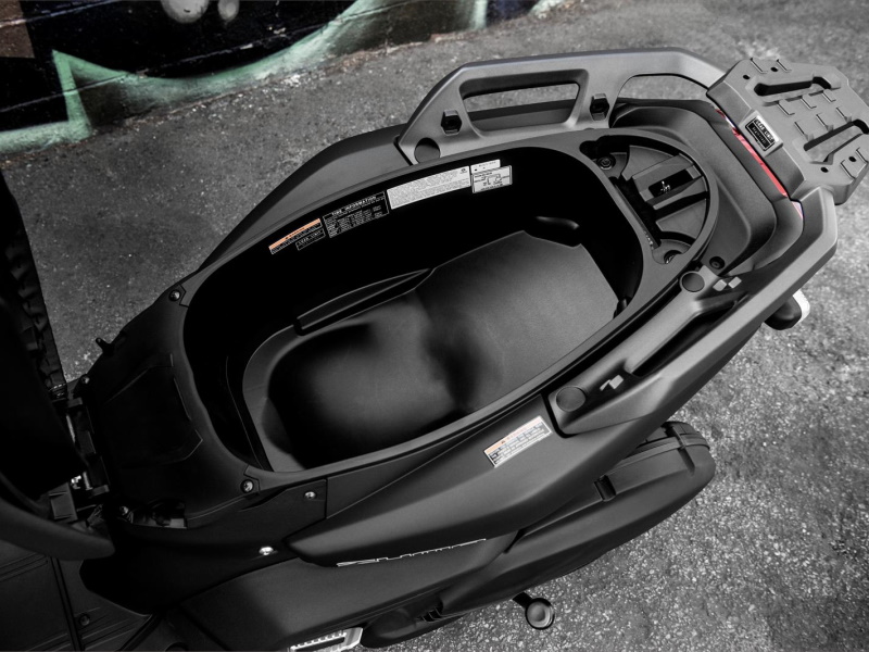 The cavernous underseat storage compartment is roomy enough for a full-face helmet and features two helmet hangers. The front storage compartment is equipped with an electric USB socket for conveniently charging your device on the go.