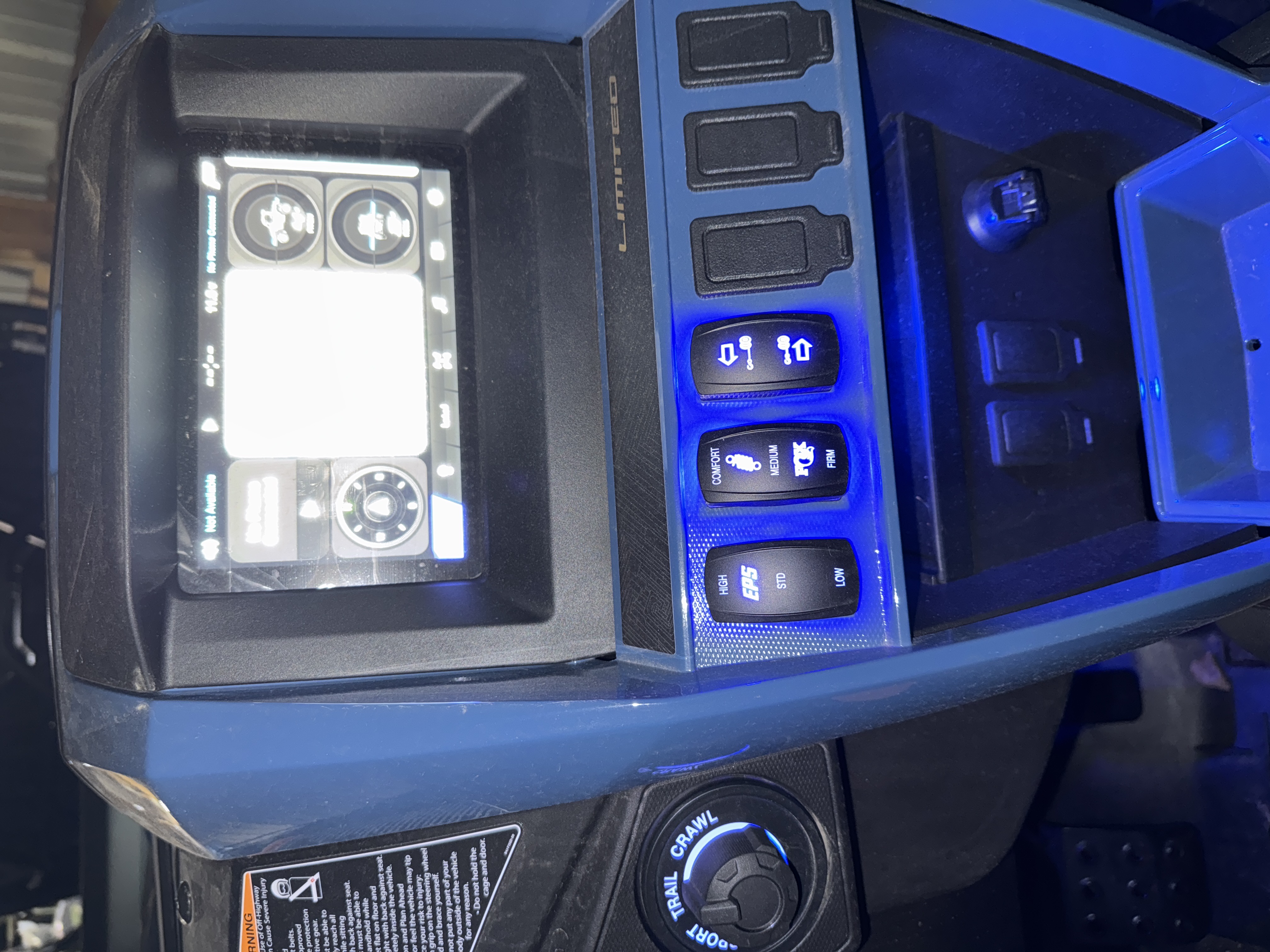 For accessibility in low-light conditions, the Wolverine RMAX2 1000 Limited features an interior light package to easily navigate controls. The blue LED lighted switches, floor lights and console lighting complement the automotive-inspired cockpit and are color-matched to the blue-backlit meter for a high-quality feel and premium look. - Premium Limited Package