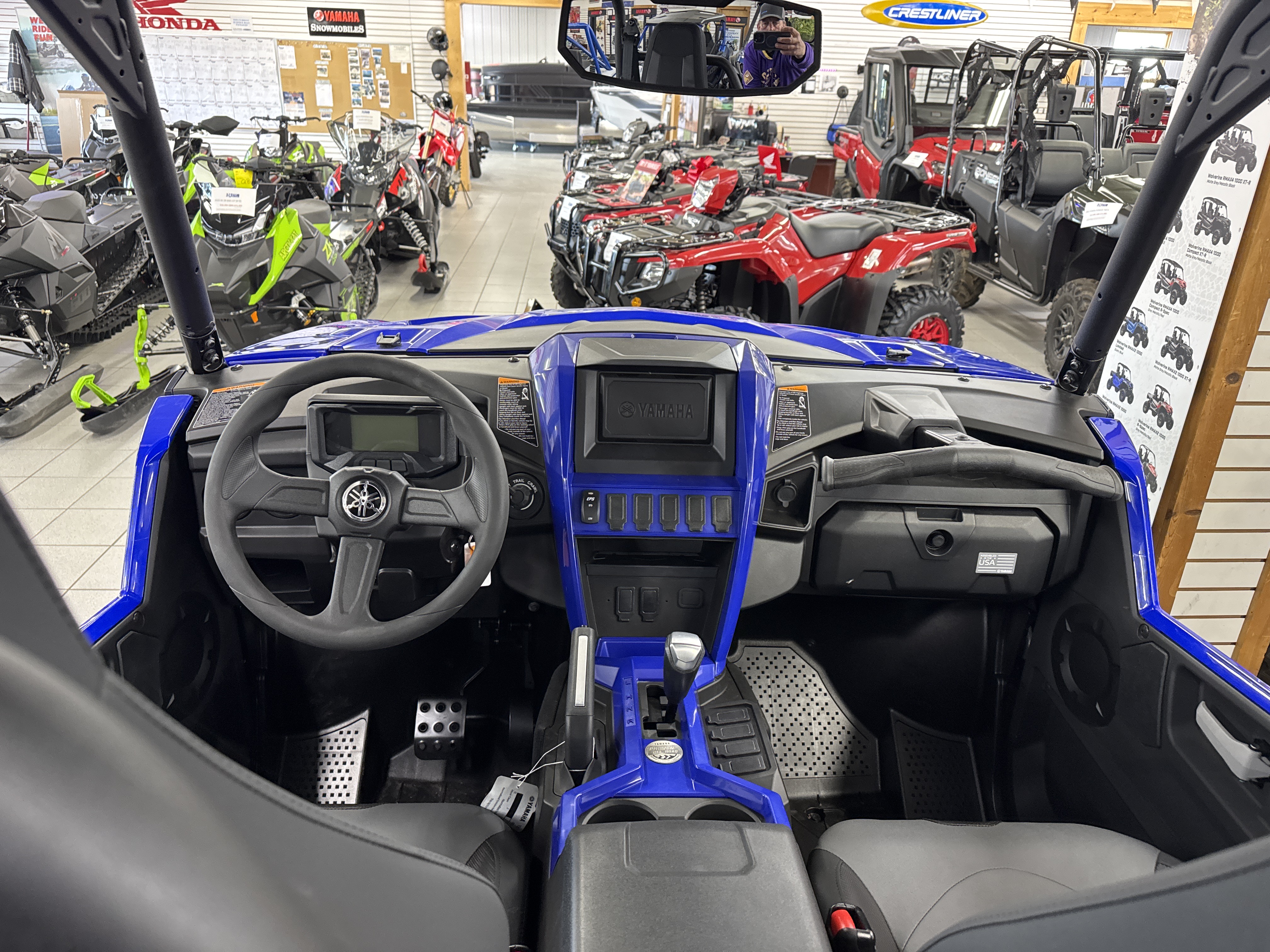 For accessibility in low-light conditions, the Wolverine RMAX2 1000 Sport features an interior light package to easily navigate controls. Blue LED lighted switches, floor lights and console lighting complement the automotive-inspired cockpit and are color-matched to the blue-backlit meter for a high-quality feel and premium look. - New Selectable Electric Power Steering